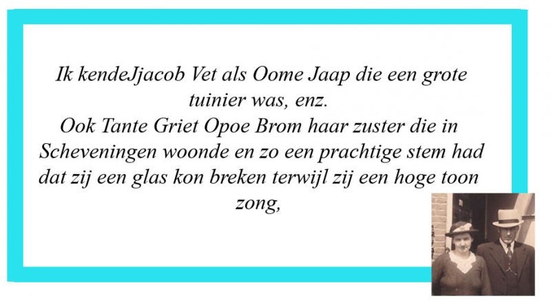 Johan Haster wrote: He knew Jacob Vet as Uncle Jaap who was a large gardener, and he remembers Auntie Griet, Grandmother Anna Brom-Vries sister, who lived in Scheveningen and had such a beautiful voice and could pitch so high that a glas would break while she was singing.