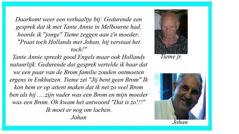 One of the memories Johan Haster has is: During a conversation per telephone that he had with Aunty Annie Brom-vd Pluijm, he heard his cousin Tieme jr say to his Mom " Speak Dutch with Johan, he can understand it!" Aunty Annie speaks English very well but also Dutch of course. During the conversation Johan told her that he was going to meet some of the Brom family members somewhere in Enkhuizen (Holland), when Tieme jr said" You aren't a Brom" where I could remind him that he was as much a Brom as he was.....Tieme's Father was a Brom and Johan's Mom was a Brom, and then the answer came "Thats true" Johan can still laugh about it.