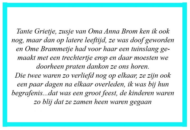 Aunty Grietje, sister to Oma Anna Brom I remember, but then at later stage of life, she had become deaf and her husband Uncle Brammetje took a hosepipe and put a funnel on one end and she would hold the hosepipe against her ear and would whilst we would talk into the hosepipe and thus making it possible for her to hear us.