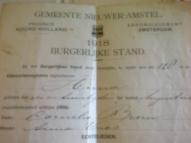Doops bewijs Fenje Brom geb. 5 maart 1909 gedoopt in Amstelveen 2. mei 1909.
