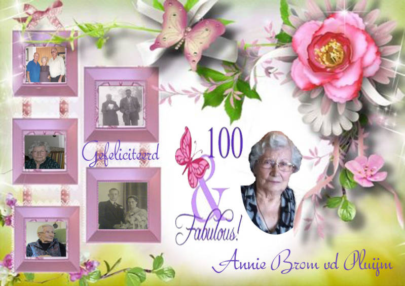 10 mei 2017 haar 100ste verjaardag. Van Harte Gefeliciteerd Tante Annie, Wij wensen U een heerlijke en gezellige dag toe en als het mag nog een tijdje bij ons mag blijven. In mijn Hart ben ik bij U en hoop dit jaar U nog te mogen zien.