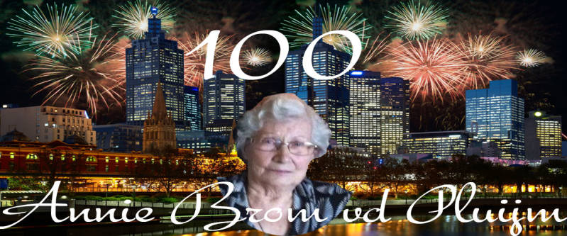 Today 10th May 1917 Annie van der Pluijm was born in Amsterdam. At the young age of 21 she married Tieme Brom [son to Cornelis Brom and Anna Brom-Vries} on the 27th July 1938. They were blessed with two sons Tijmen Jacob and Peter Johannes. 11th August 1952 they left Holland to settle in Australia where they soon found Melbourne to be their new home town. She is Ouna of 8 grandchildren, 23 great grandchildren and 17 great great grandchildren. Still independant and with sound mind she is living with her two dearest little dogs and is celebrating today 10 th May 2017 her 100th Birthday.