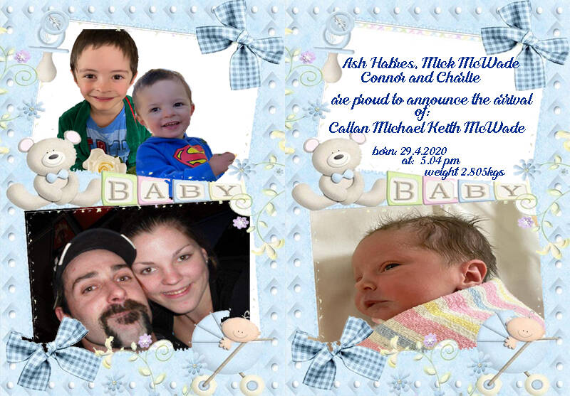We great pleasure I would like to introduce to the family the new baby Boy Callan Michael Keith McWade born 29.4.2020 to Ash Habres and Mick McWadee. Congratulations on the new born baby Callan wishing you all much love, joy and happiness Also Connor and Charlie Congratulations on your little baby brother.