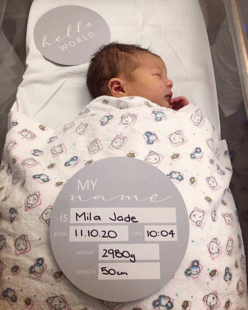 Renae Clarkson en Michael Genua zijn de trotse ouders van kleine meisje Mila Jade, geboren 11 october 2020 om 10.04 vm weegt 2980 kg en 50 cm lang.